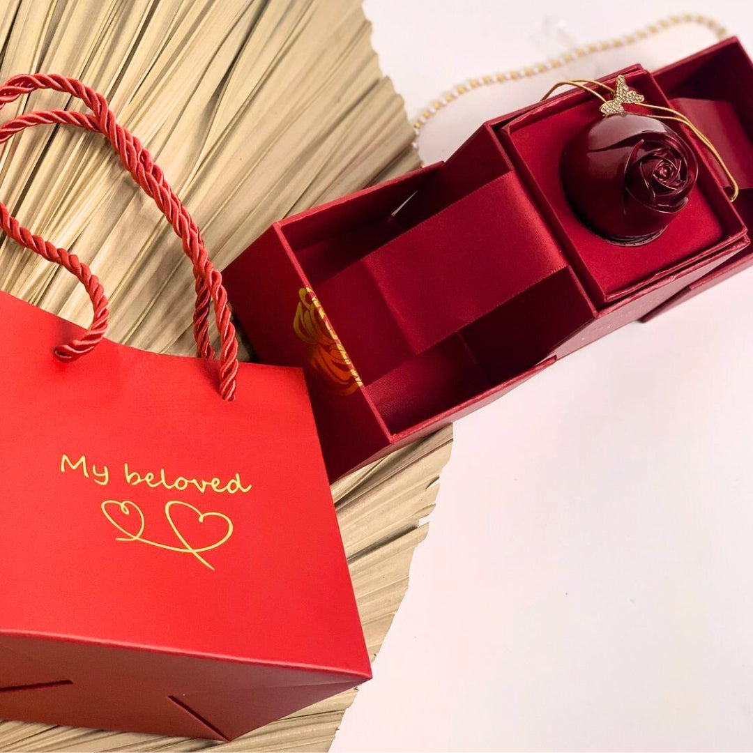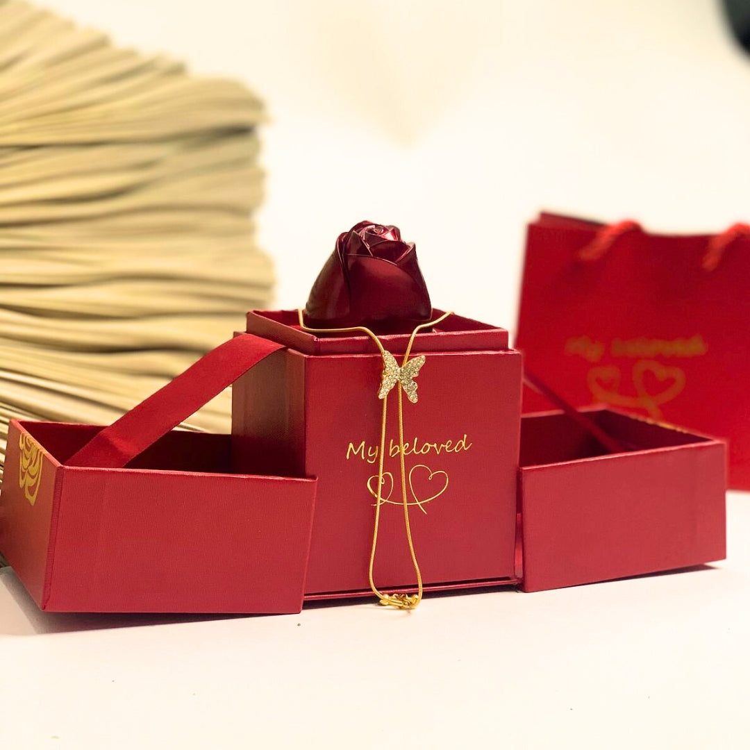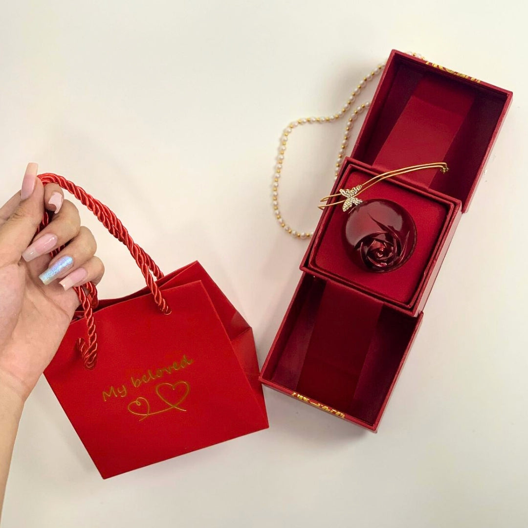 Un collar que simboliza amor y transformación, en un cofre con rosa eterna. Un detalle único para mamá.