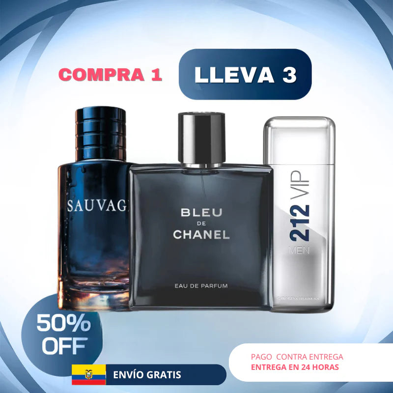El Kit X3 incluye tres fragancias premium con aromas distintivos: One Million destaca por sus notas cítricas, canela y cuero con un toque sensual de ámbar; Bleu de Chanel combina cítricos frescos con madera de sándalo y vetiver para un aroma elegante y masculino; mientras que 212 VIP Black fusiona absenta, especias cálidas y cuero negro creando una fragancia intensa y misteriosa perfecta para ocasiones nocturnas.