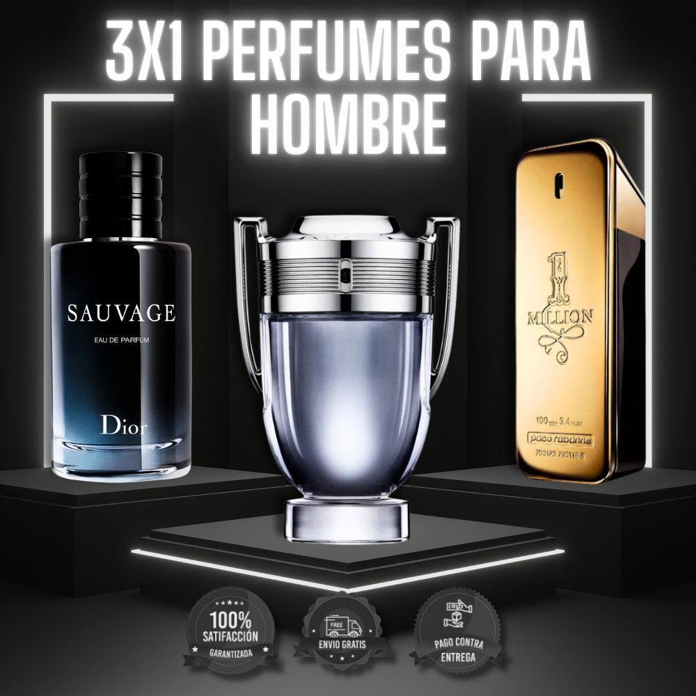 Invictus tiene notas de menta, limón y vainilla con un aroma seductor. Sauvage combina bergamota y pimienta con frescura masculina. One Million ofrece cítricos, jengibre y sándalo con elegancia sofisticada. Tres personalidades únicas para cada ocasión.